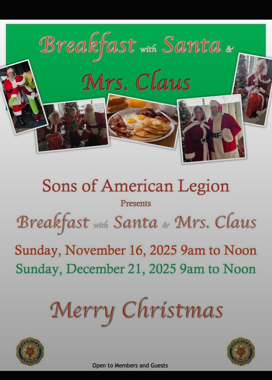 The American Legion in Union Beach, NJ is hosting Santa and Mrs. Claus for its members and guests on December 21, 2025 from 9am to noon. Breakfast is also available for $10. Get more details.